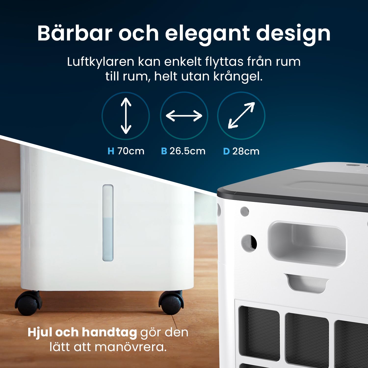 Portable: Pre-assembled and equipped with four wheels that allow you to easily move the air cooler between different rooms. Dimensions: 26.5 cm x 28 cm x 70 cm.
