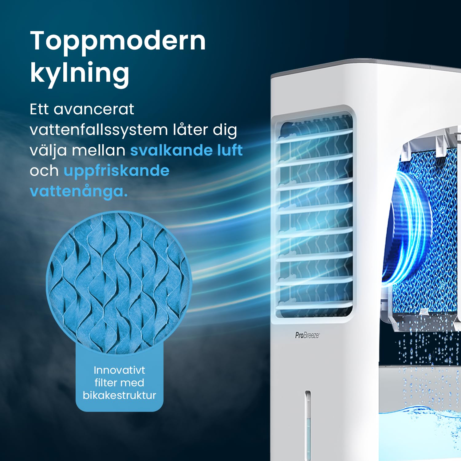 Advanced cooling technology: Portable air cooler is equipped with a market-leading waterfall system with a honeycomb structure that sends warm air over ice-cold water, which is then cooled and sent out into the room.